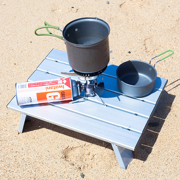 ソロ用クッキングセットは持ち物の少なさに重点を置き、身軽ですぐにお湯を沸かせて温かい物を食べられるよう軽量&コンパクトにまとめています。