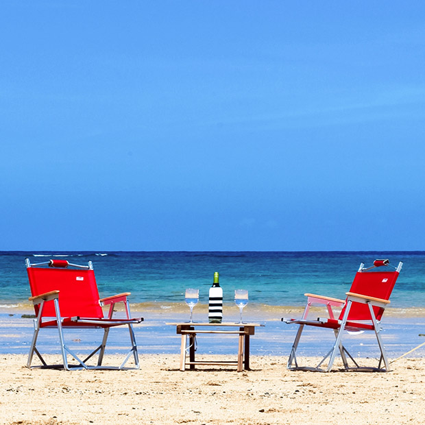カップル用にはウッド調のローテーブルとコールマンのローチェアで纏まりのある組み合わせです。2人で過ごすのにちょうどいい大きさのテーブルです。