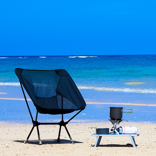 テーブルとチェアは極力コンパクトに、軽量で持ち運びしやすい物を選んでいます。バックパックにも納まるサイズなので外へ持ち出して沖縄のアウトドアを楽しんでください。